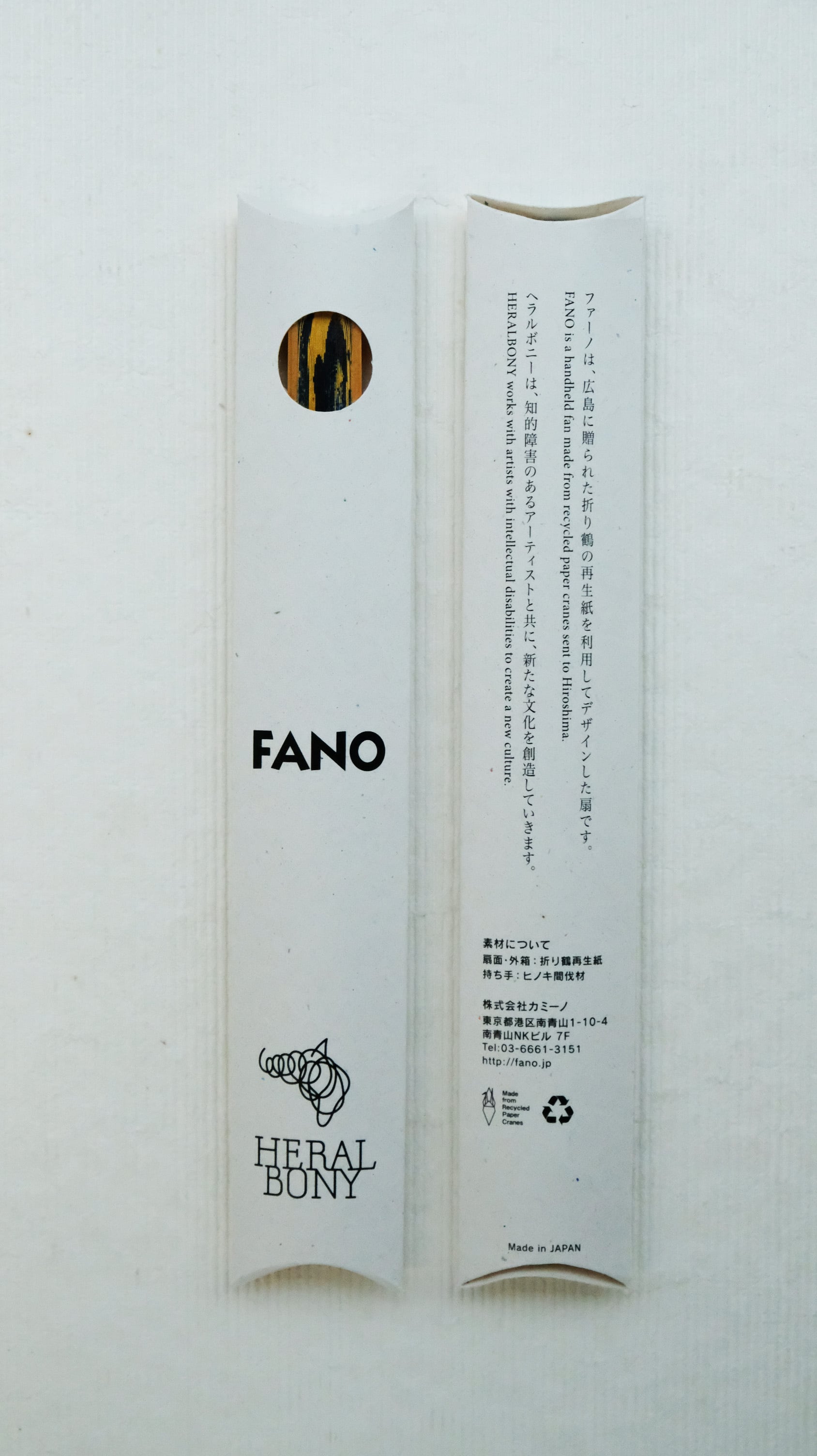 扇部分は折り鶴再生紙で作られており、持ち手部分及び持ち手紐を固定する留め具の素材はヒノキの間伐材。側面にはFANOの刻印入りです。扇部分と同じ折り鶴再生紙でつくられたパッケージが付いています。